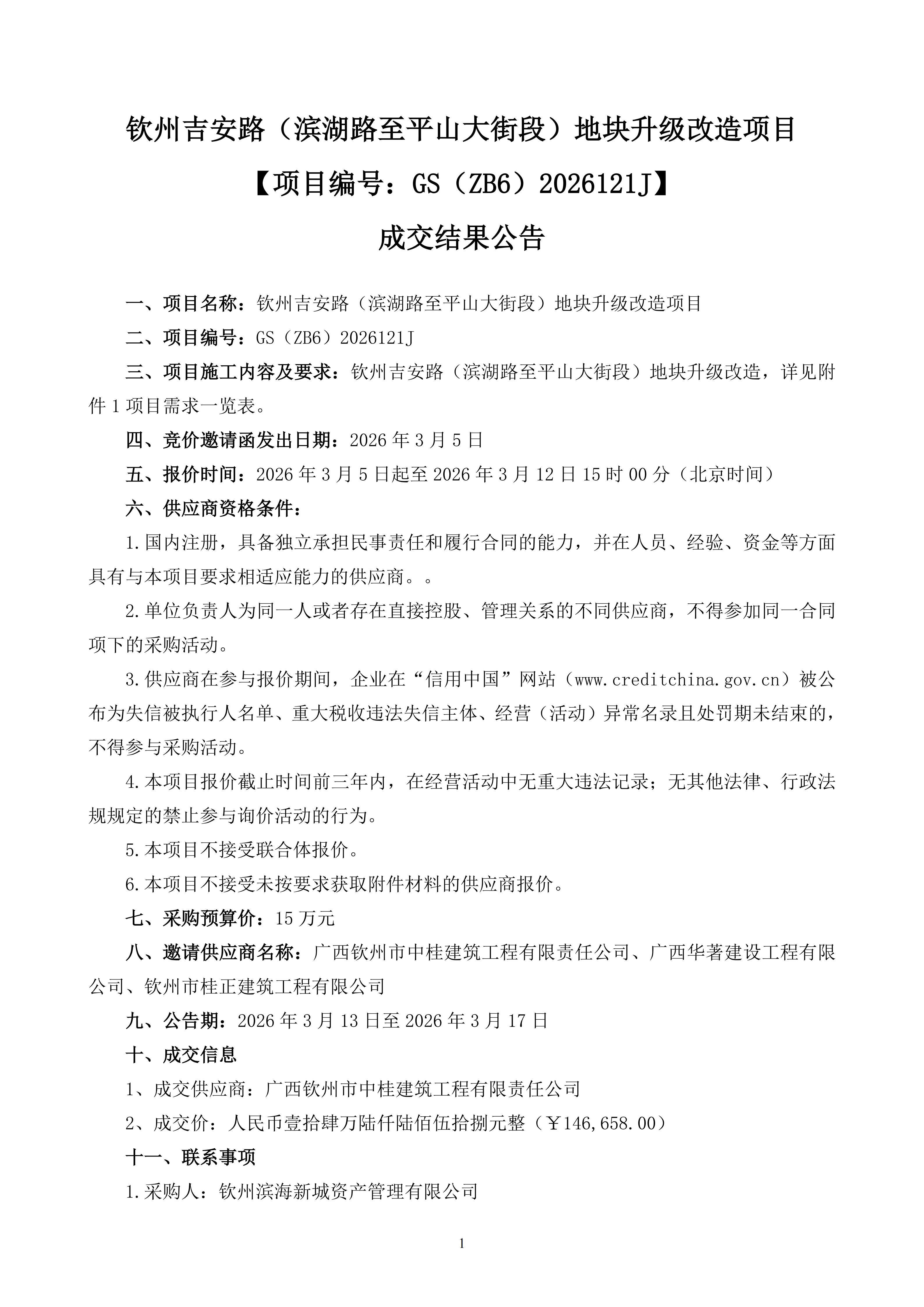 欽州吉安路(濱湖路至平山大街段)地塊升級(jí)改造項(xiàng)目 【項(xiàng)目編號(hào):GS(ZB6)2026121J】 成交結(jié)果公告