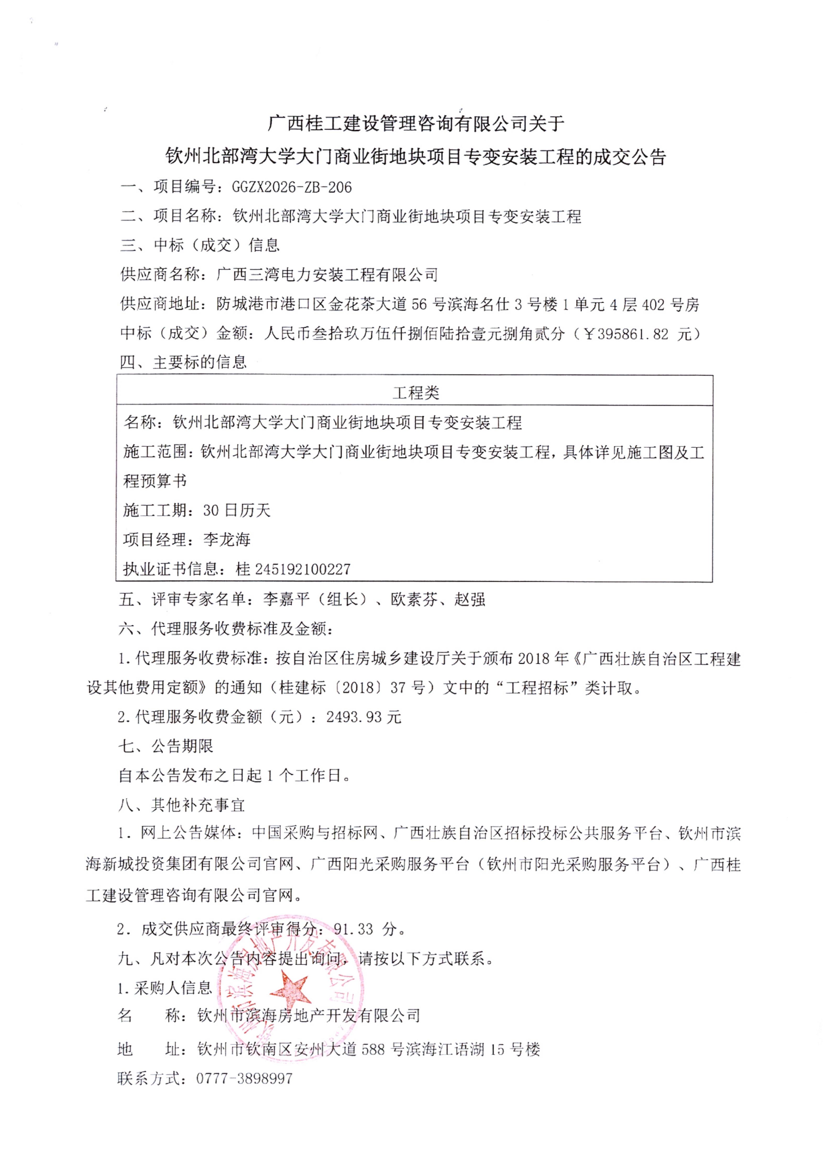 欽州北部灣大學(xué)大門(mén)商業(yè)街地塊項(xiàng)目專(zhuān)變安裝工程成交公告