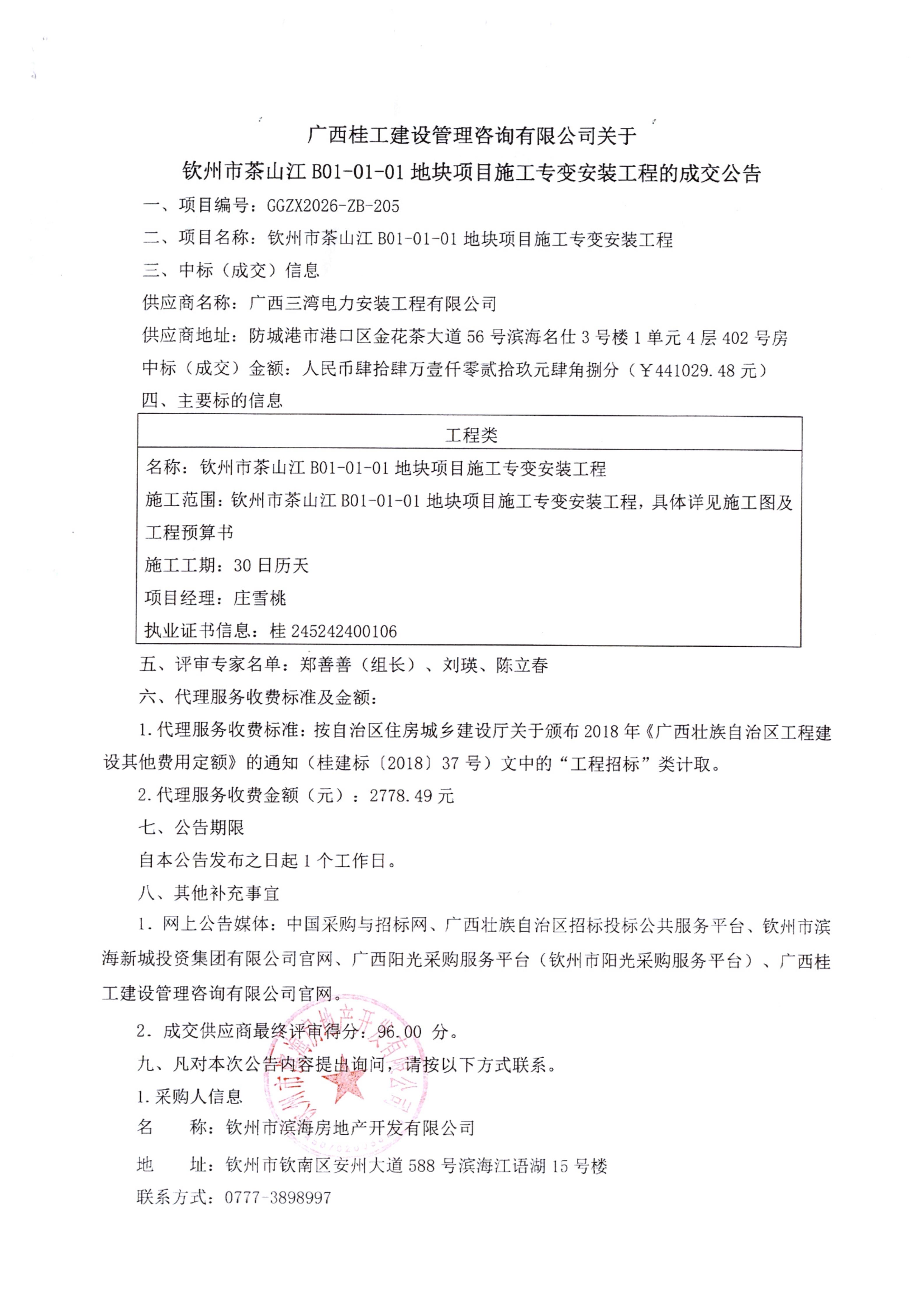 欽州市茶山江B01-01-01地塊項(xiàng)目施工專(zhuān)變安裝工程成交公告