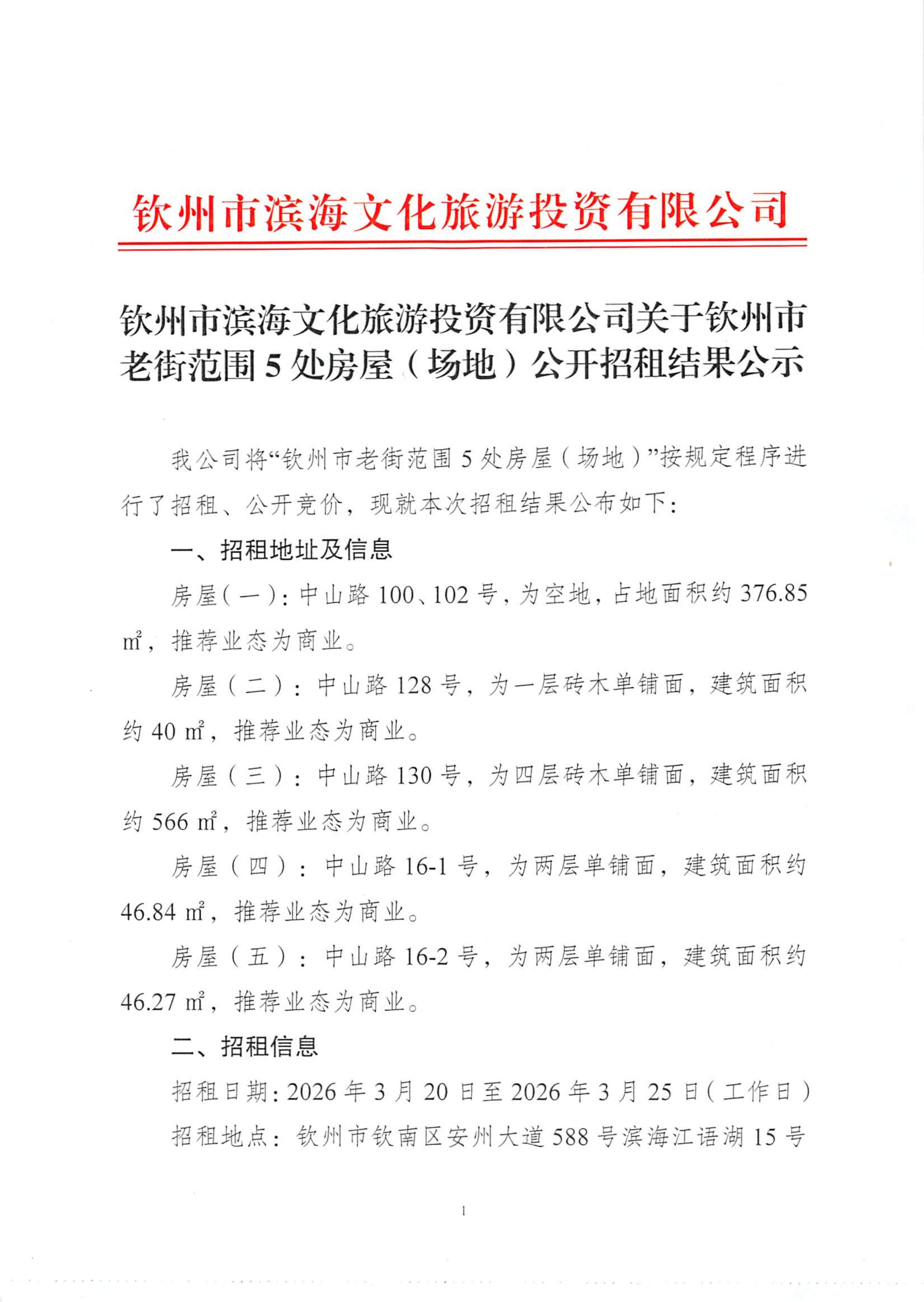 欽州市濱海文化旅游投資有限公司關(guān)于欽州市老街范圍5處房屋(場(chǎng)地)公開(kāi)招租結(jié)果公示