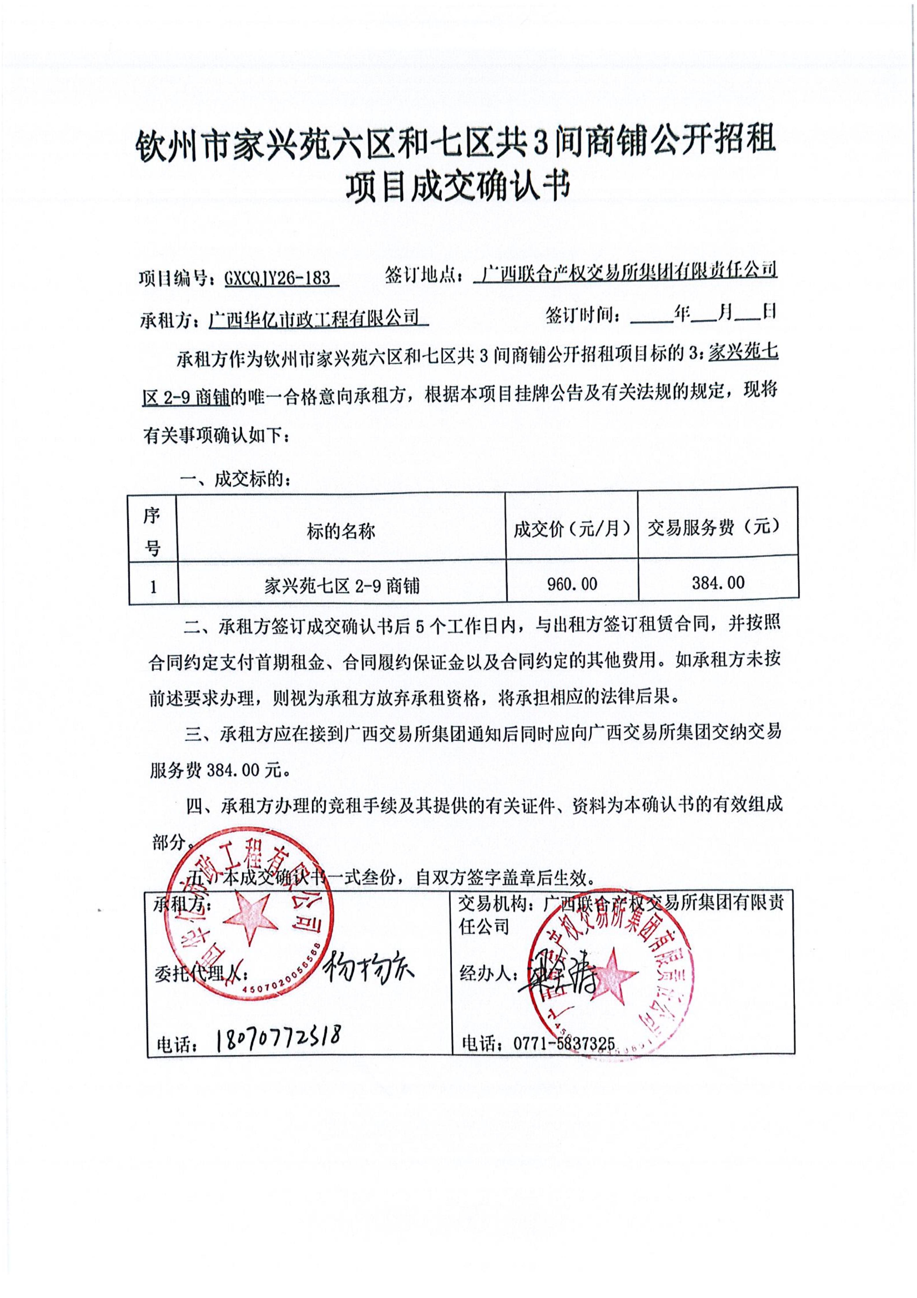 欽州市家興苑六區(qū)和七區(qū)共3間商鋪公開(kāi)招租項(xiàng)目成交確認(rèn)書(shū)