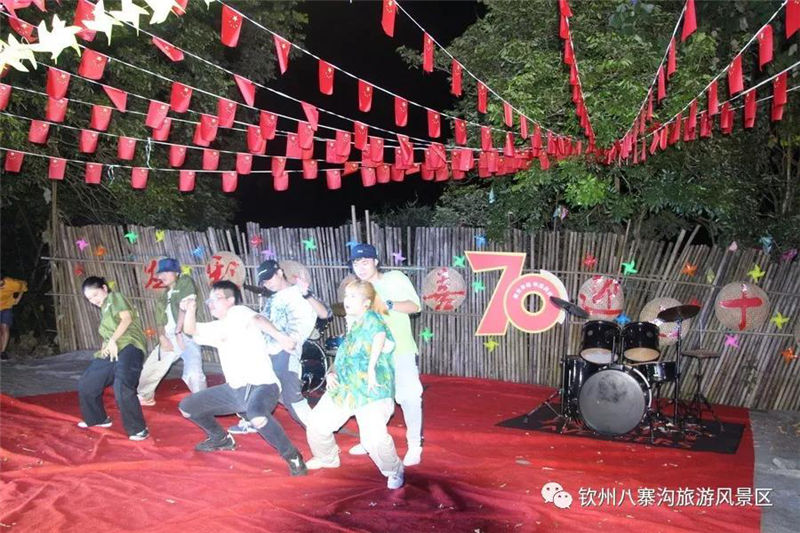 國(guó)慶期間景區(qū)舉辦以“炫彩八寨喜迎70華誕”為主題活動(dòng),受到眾多游客親睞。游客們白天可以觀看精彩歌舞文藝演出,賞彩虹風(fēng)車展,玩真人CS運(yùn)動(dòng),體驗(yàn)欽州第一漂的八寨溝森林漂流,登山泡山泉潑水狂歡,徒步暢游原始森林的美景,呼吸天然氧吧里的新鮮空氣,整個(gè)景區(qū)呈現(xiàn)一片游客如織、喜樂(lè)融融的景象。