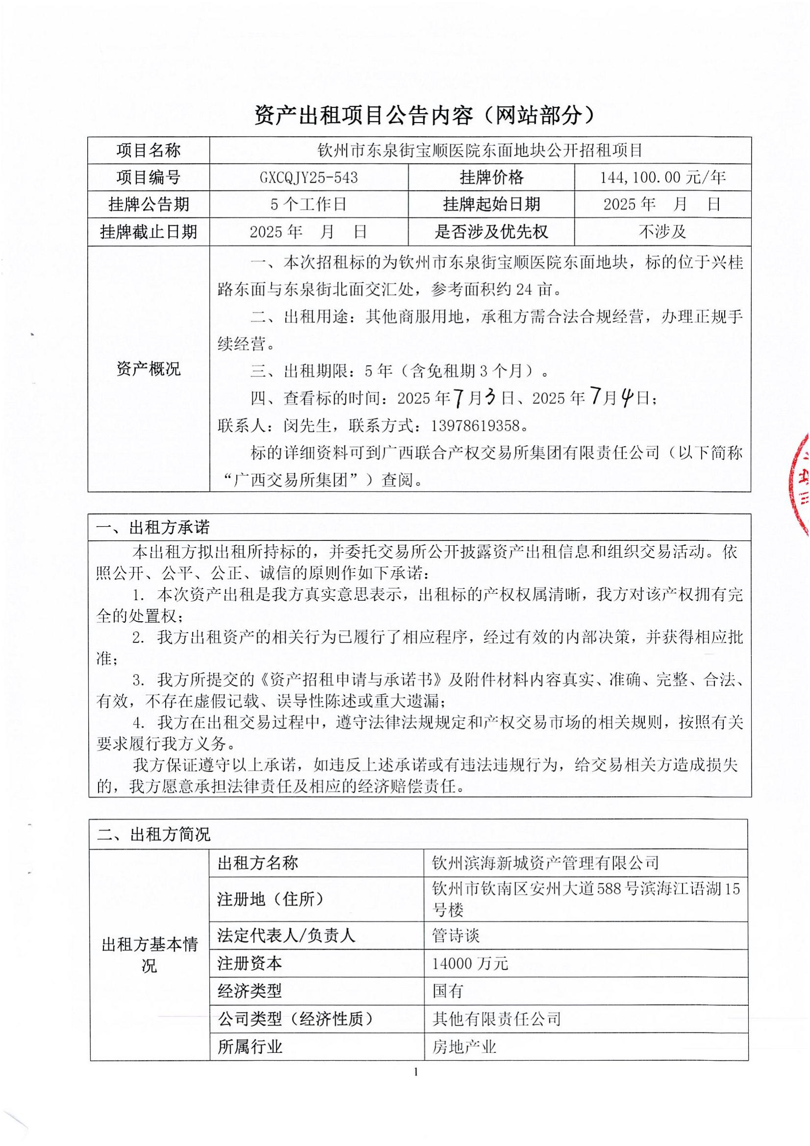 欽州市東泉街寶順醫(yī)院東面地塊公開招租項目