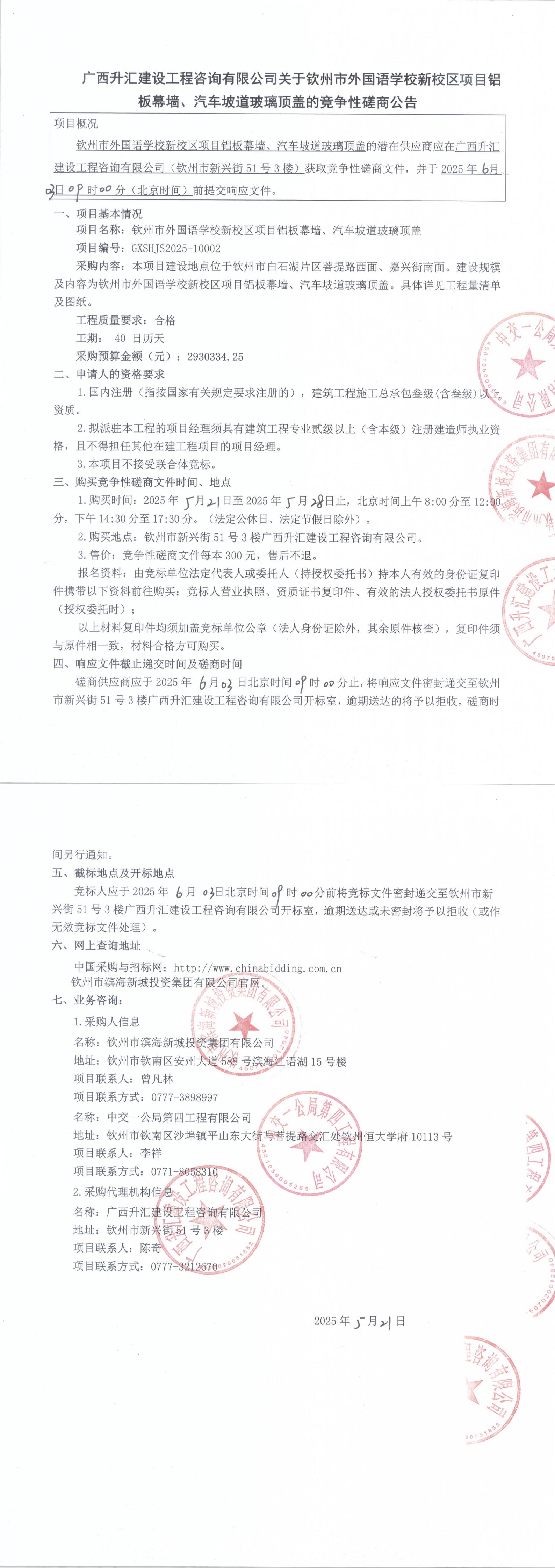 廣西升匯建設工程咨詢有限公司關(guān)于欽州市外國語學校新校區(qū)項目鋁板幕墻、汽...