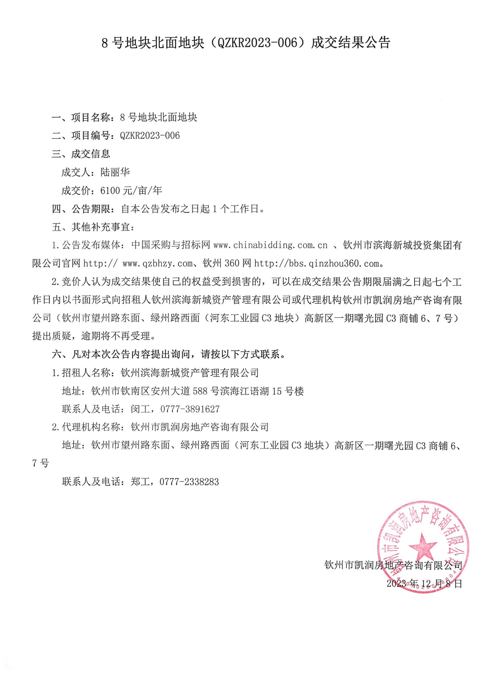 8號地塊北面地塊(QZKR2023-006)成交結果公告