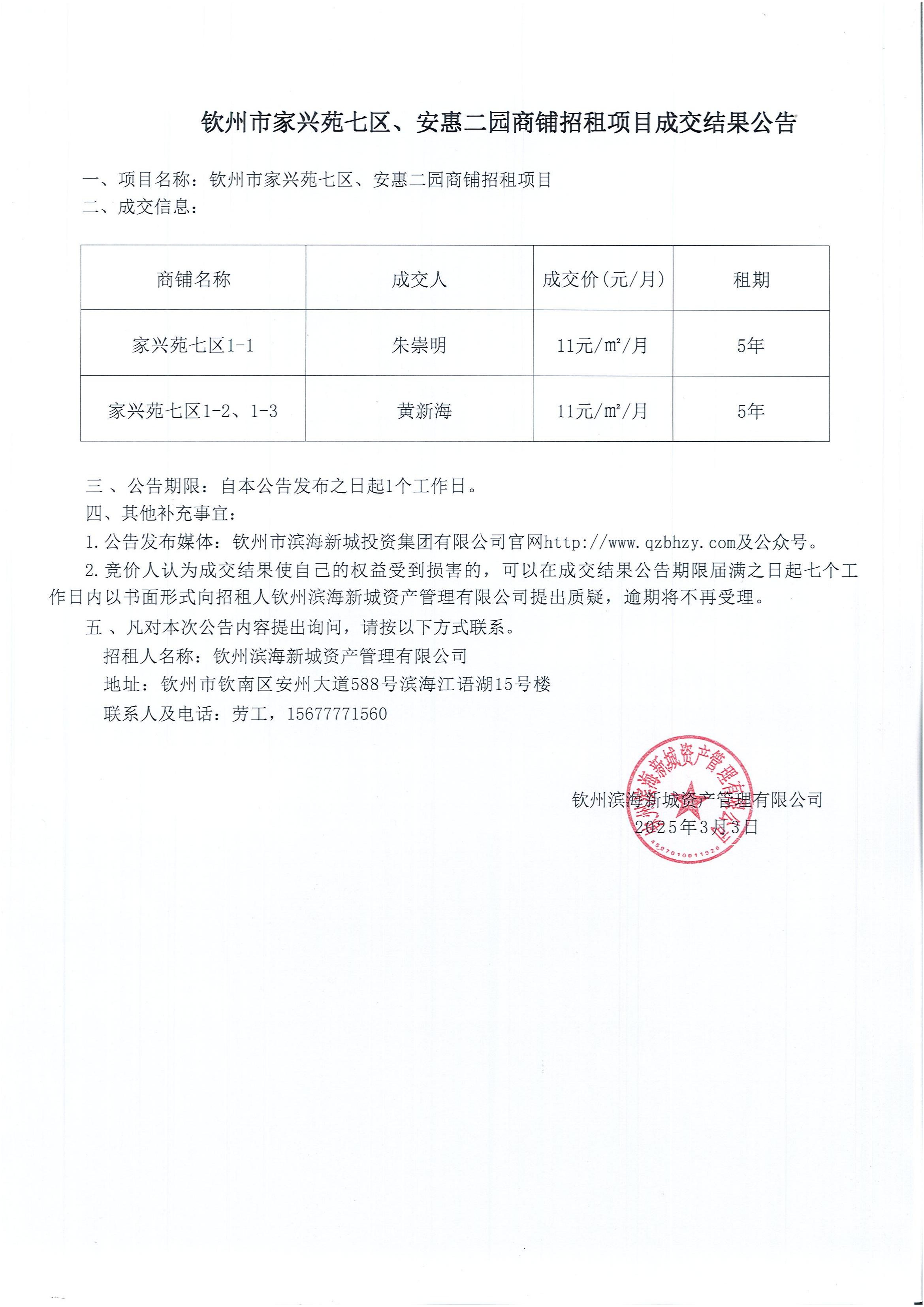 欽州市家興苑七區(qū)、安惠二園商鋪招租項目成交結(jié)果公告