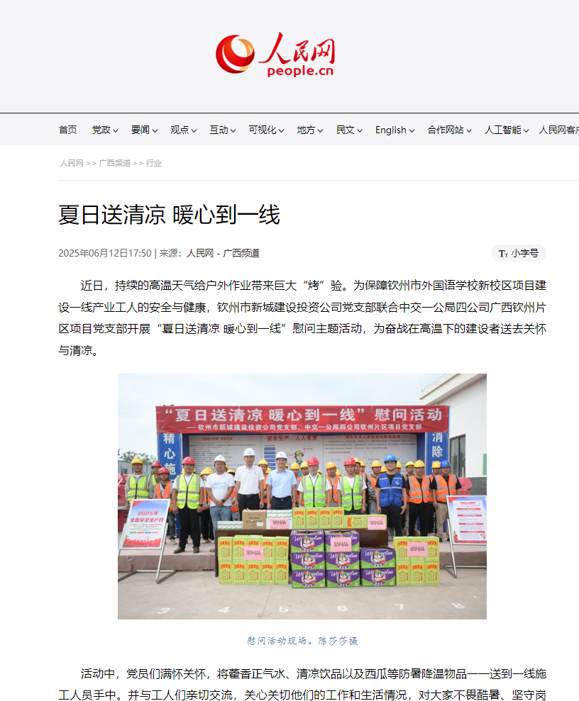 6月12日,人民網(wǎng)-廣西頻道以《夏日送清涼 暖心到一線》為題報道市濱投集團(tuán)公司黨委下屬建投公司黨支部......