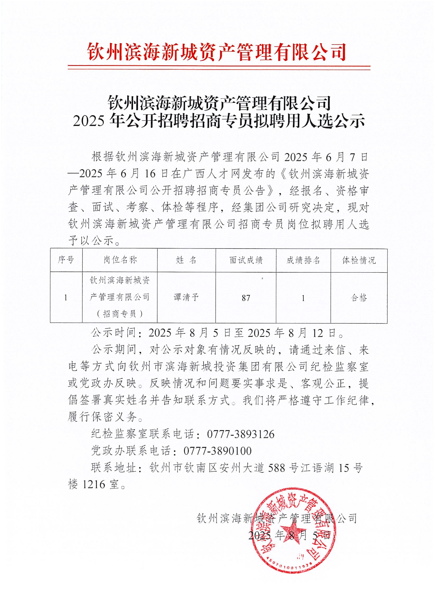 欽州濱海新城資產(chǎn)管理有限公司2025年公開(kāi)招聘招商專(zhuān)員擬聘用人選公示
