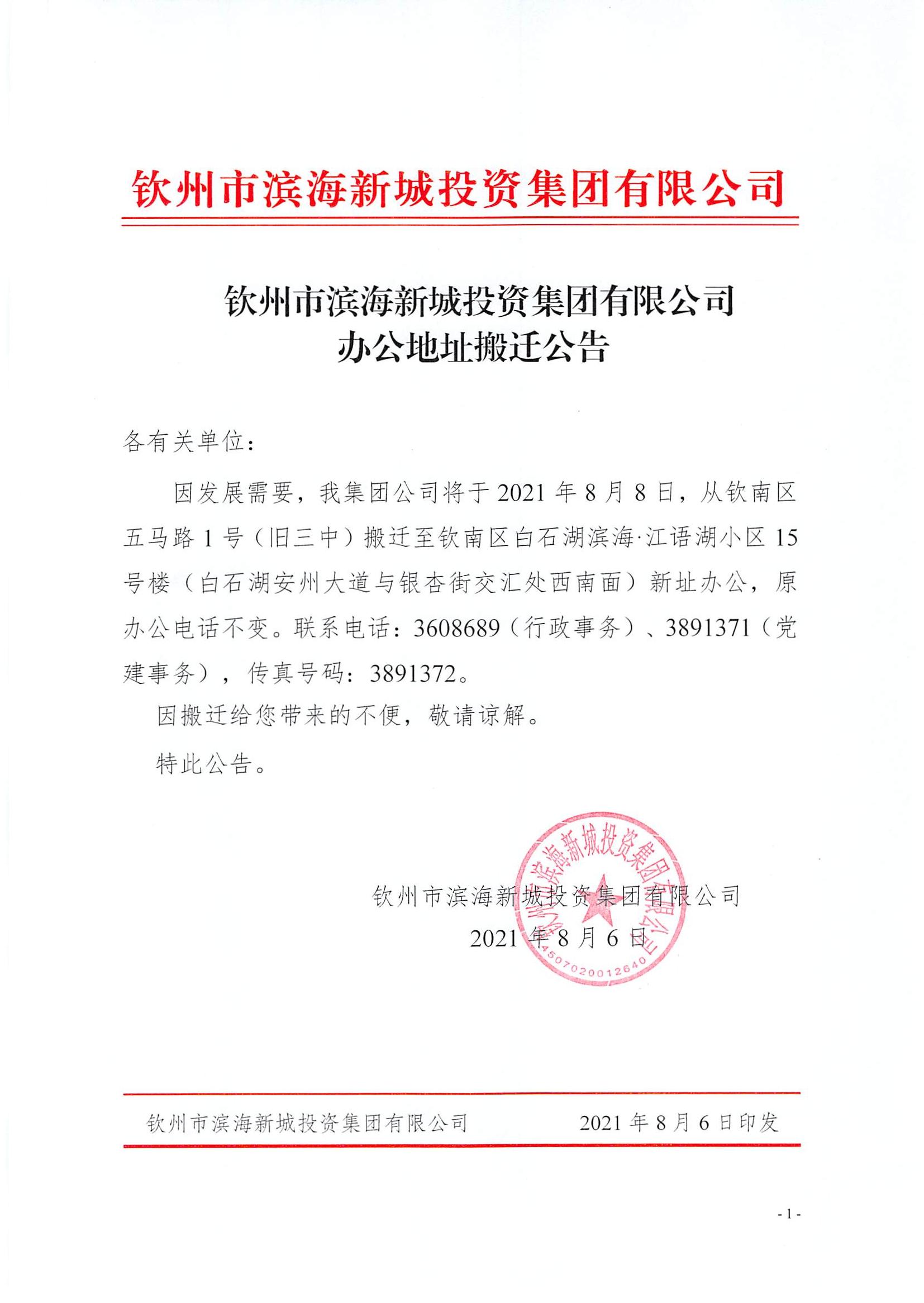 欽州市濱海新城投資集團(tuán)有限公司辦公地址搬遷公告