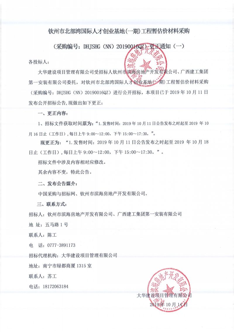 欽州市北部灣國(guó)際人才創(chuàng)業(yè)基地(一期)工程暫估價(jià)材料采購(gòu)更正通知(一)