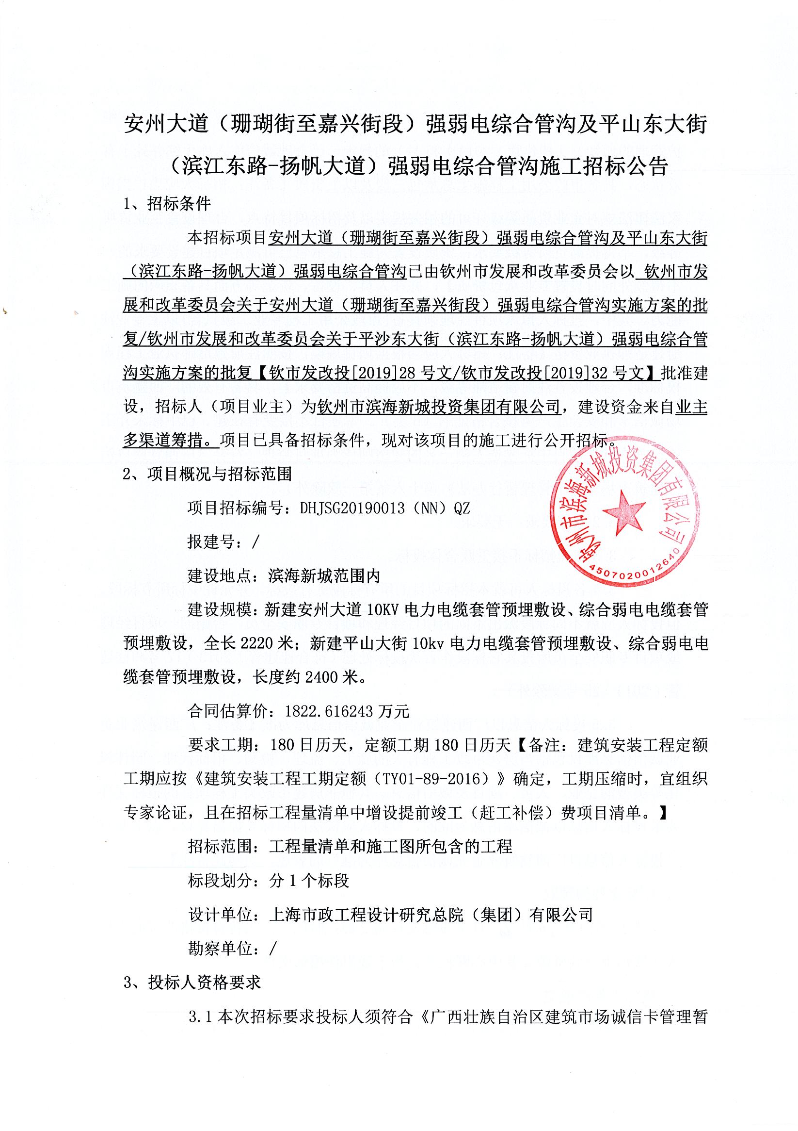 安州大道(珊瑚街至嘉興街段)強(qiáng)弱電綜合管溝及平山東大街(濱江東路-揚(yáng)帆大道)強(qiáng)弱電綜合管溝施工招標(biāo)公告