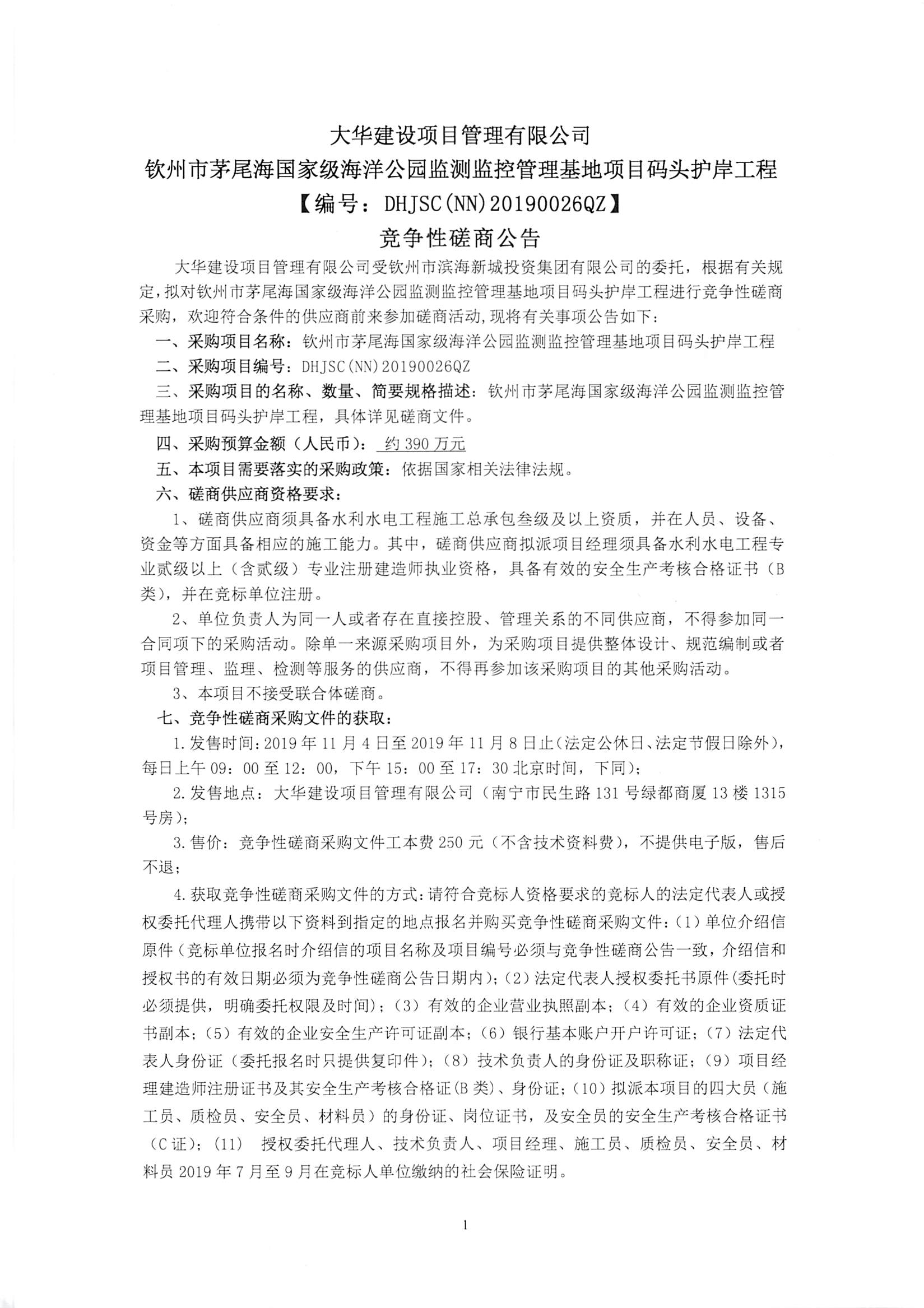 競(jìng)爭(zhēng)性磋商公告--欽州市茅尾海國(guó)家級(jí)海洋公園監(jiān)測(cè)監(jiān)控管理基地項(xiàng)目碼頭護(hù)岸工程