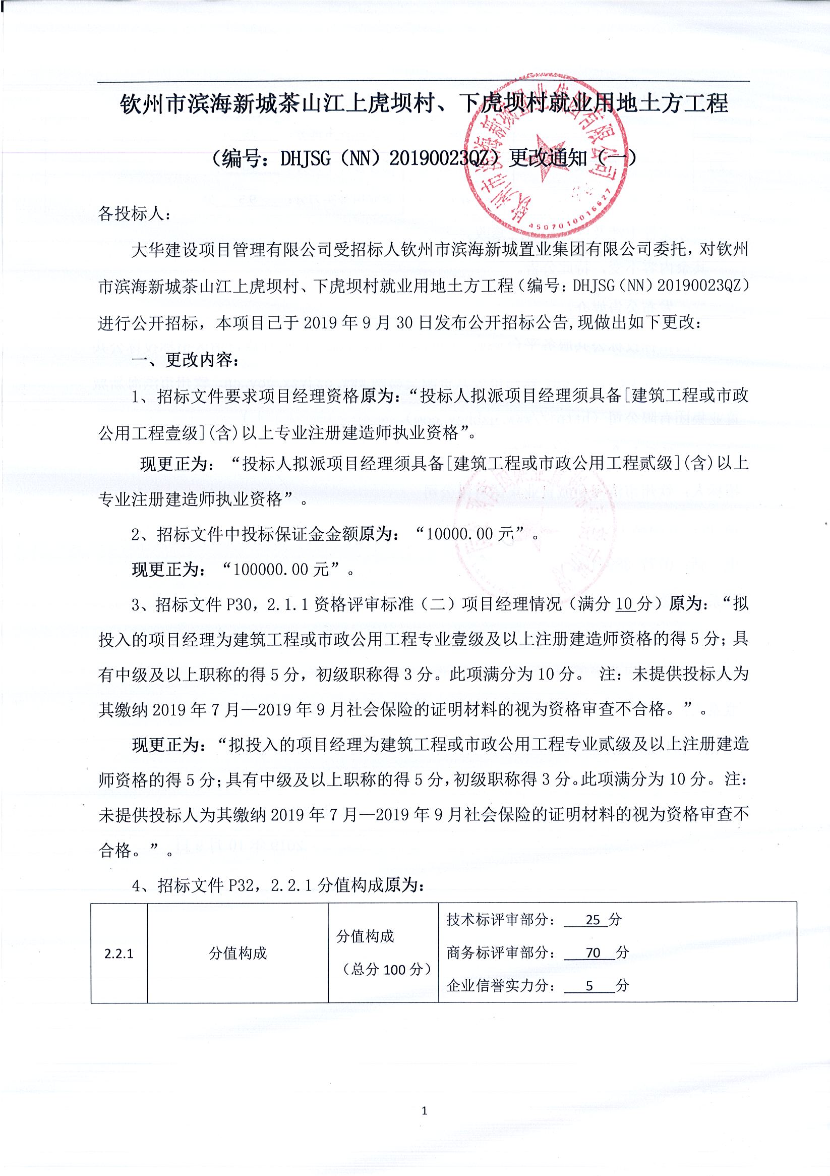 欽州市濱海新城茶山江上虎壩村、下虎壩村就業(yè)用地土方工程(編號(hào):DHJSG(NN)20190023QZ)更改通知(一)