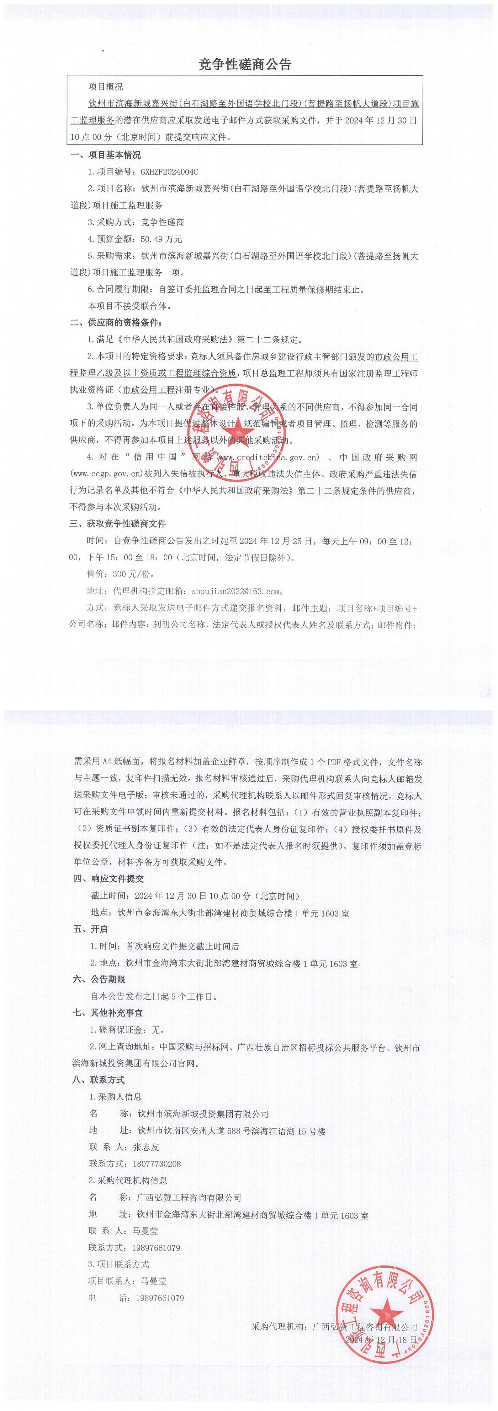 競爭性磋商公告(欽州市濱海新城嘉興街(白石湖路至外國語學(xué)校北門段)(菩提路至揚(yáng)帆大道段)項(xiàng)目施工監(jiān)理服務(wù))