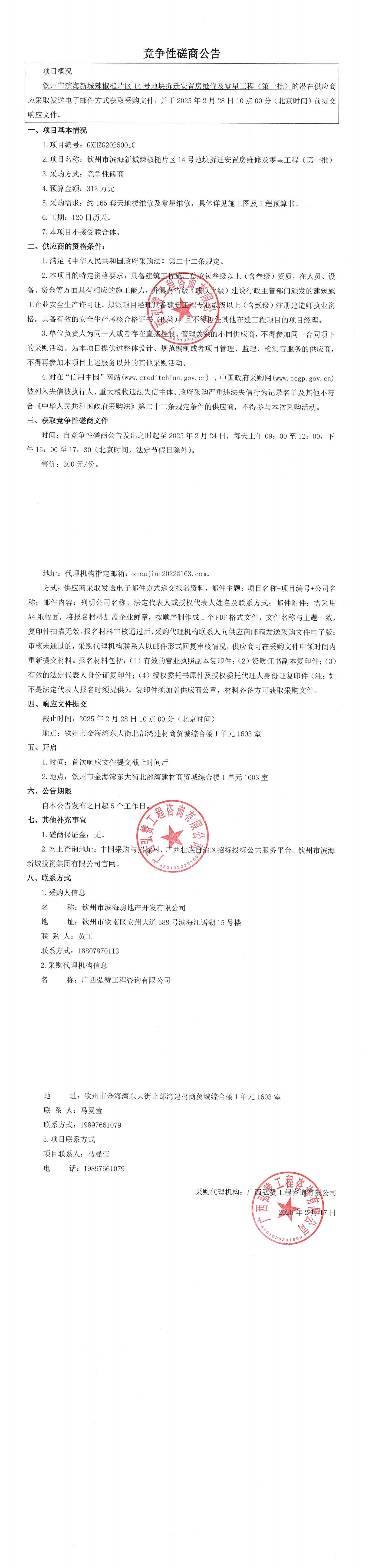 欽州市濱海新城辣椒槌片區(qū)14號(hào)地塊折遷安置房維修及零星工程(第一批)競爭性磋商公告