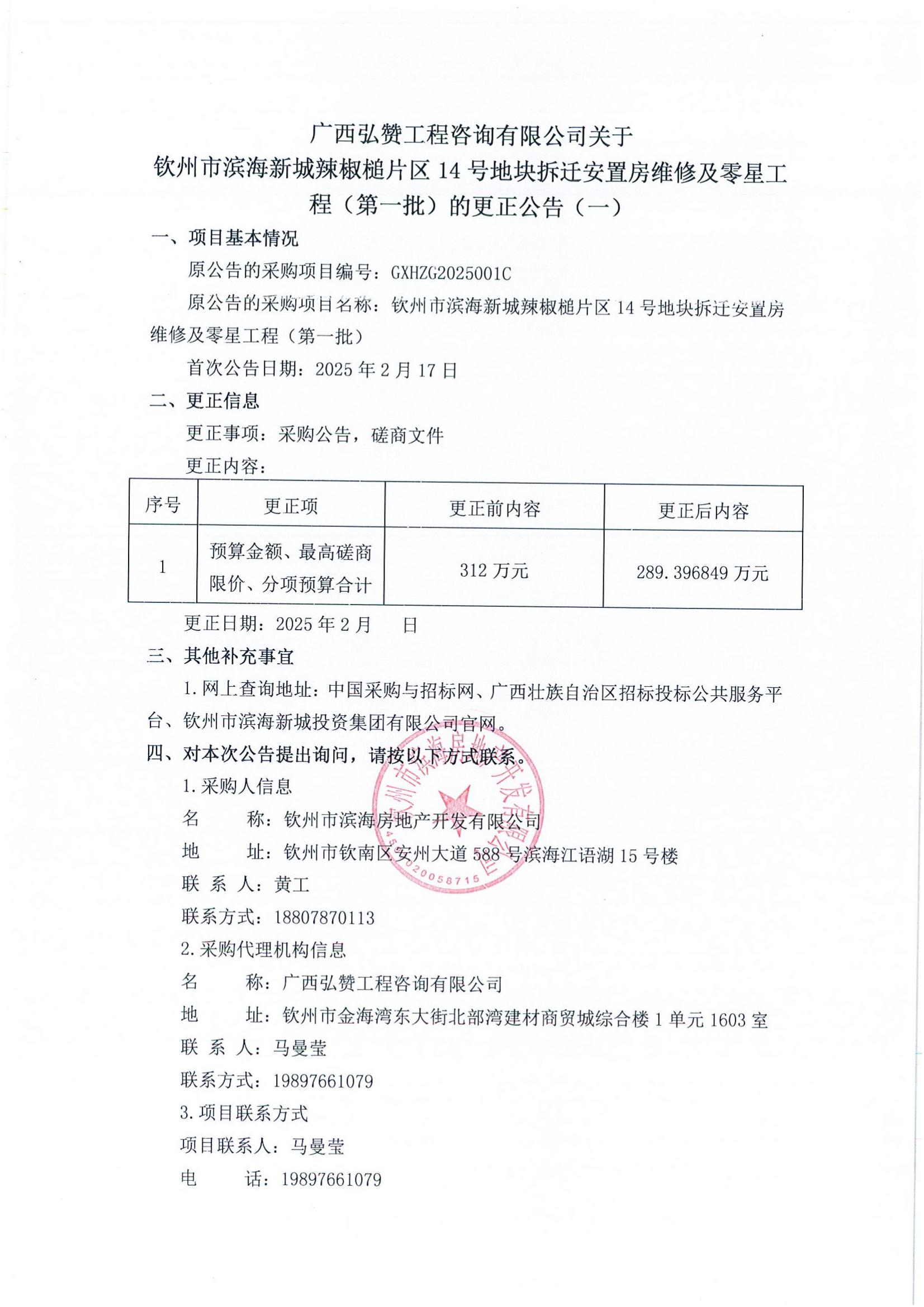 欽州市濱海新城辣椒槌片區(qū)14號(hào)地塊拆遷安置房維修及零星工程(第一批)的更正公告