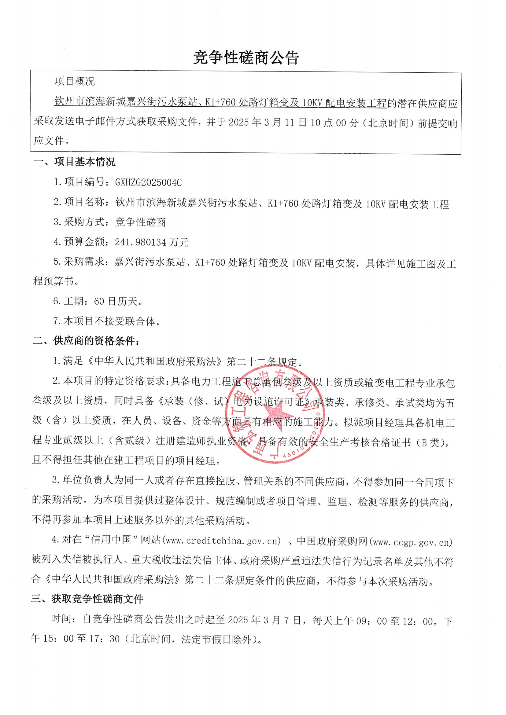 欽州市濱海新城嘉興街污水泵站、K1+760處路燈箱變及10KV配電安裝工程競爭性磋商公告