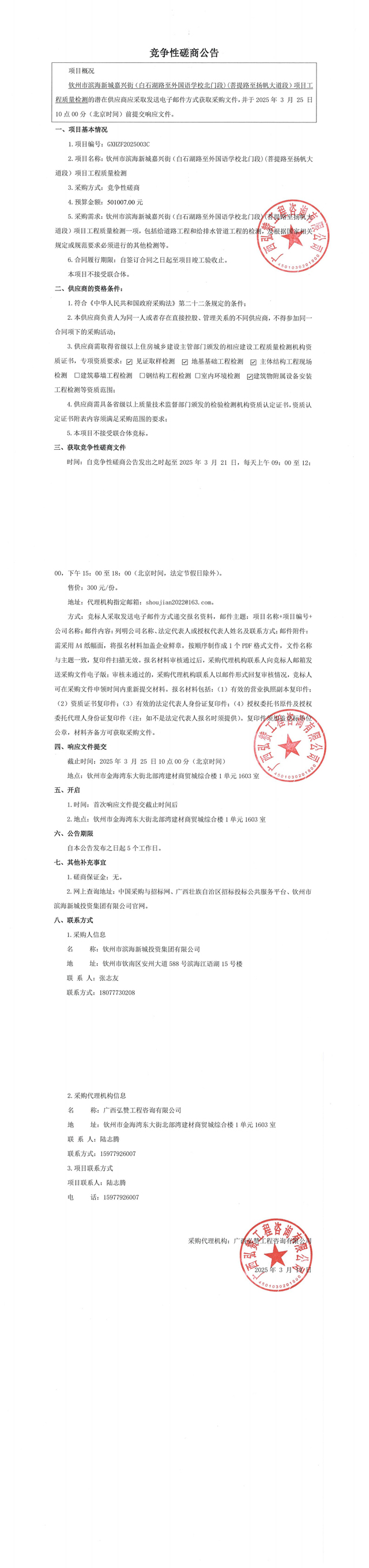 競爭性磋商公告-欽州市濱海新城嘉興街(白石湖路至外國語學(xué)校北門段)(菩提路至揚(yáng)帆大道段)項(xiàng)自工程質(zhì)量檢測