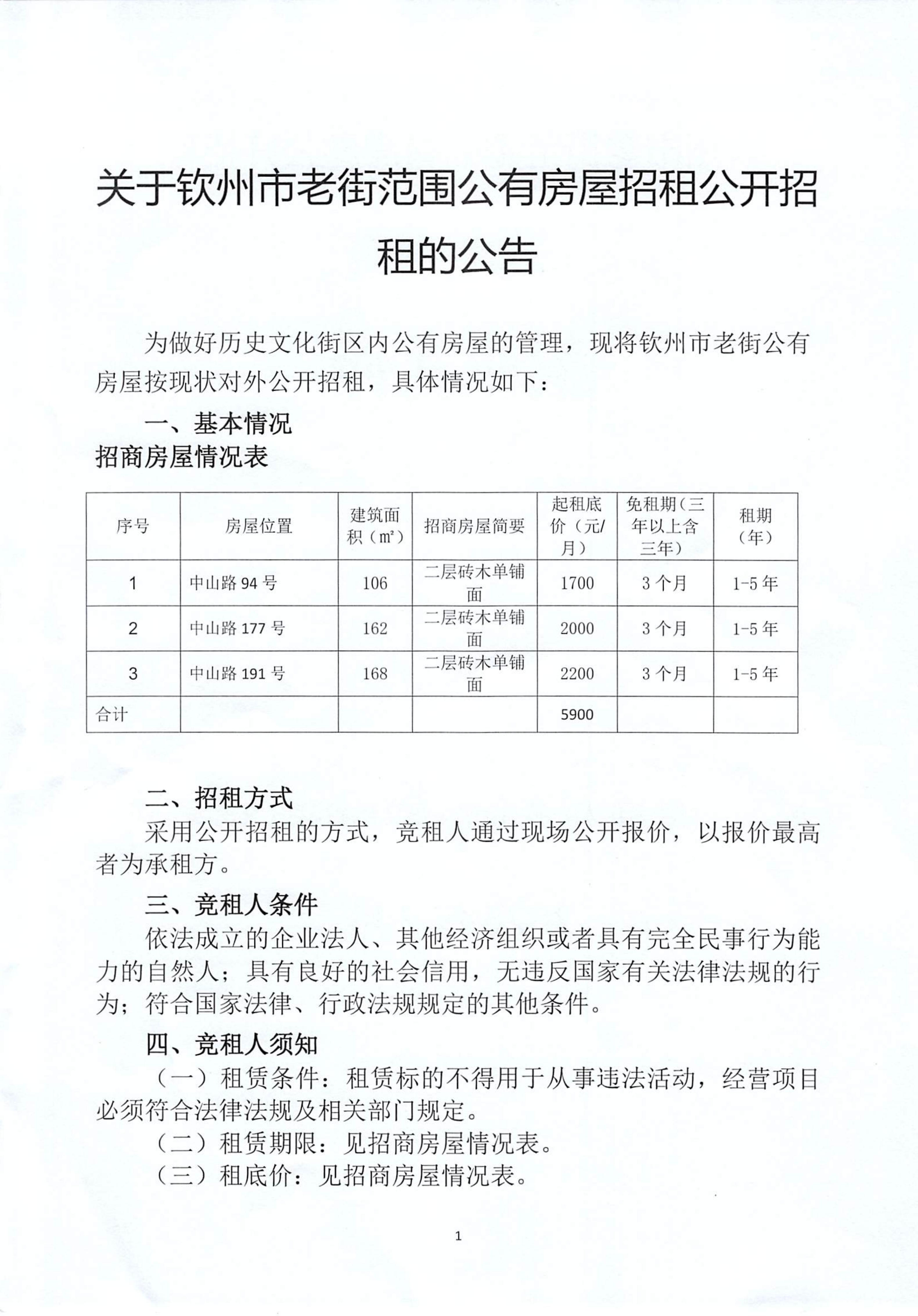 關(guān)于欽州市老街范圍公有房屋招租公開招租的公告(中山路110號、中山路124號、中山路195-2號))